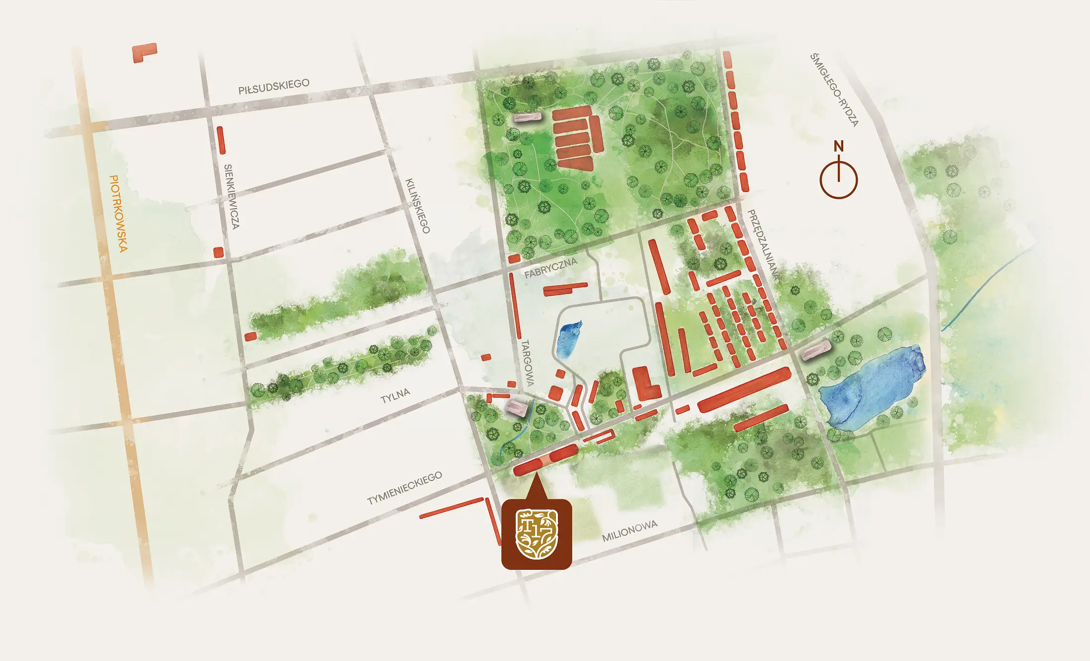 Księży Młyn to jedno z najbardziej pożądanych miejsc do życia w Łodzi. T17 znajduje się w jej sercu, na terenie dawnego imperium Scheiblerów i Grohmanów. W sąsiedztwie rozciągają się historyczne ogrody, fabryki oraz pałace fabrykantów, a ducha historii czuć na każdym kroku. Księży Młyn to także miejsce pełne wyjątkowych tras spacerowych, galerii sztuki i klimatycznych kawiarni.